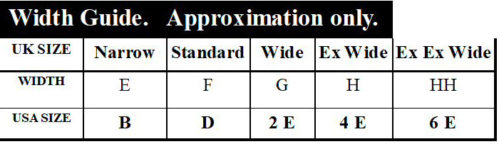 Each brand can vary in how they convert US and EU sizes to UK sizes, using a standard footwear conversion chart can cause confusion and lead to customers ordering the incorrect size. For this reason, on each product page in the sizing menu, we use a size conversion that is specific to each individual item. All footwear is sold is in UK sizes but please refer to these charts to see how these translate into USA and EU sizes. To help in your search for the right fitting shoe we also include width fittings as a guide. So just click on the UK size you are looking for, as well as the width fitting and you will see footwear that is suitable for you. If you take a Wide fitting, there are many styles which are suitable. However if you need to compare, we are always willing to offer advice, just give us a call at the store. I have been in the retail business for many years and have the knowledge to assist you in anyway. Please see chart below for an approximation of the size.