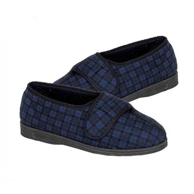 Textile uppers, with textile lining and smooth anti slip rubber sole. Mini Tartan check design. Washable fabric. Extra cushioned inner for added comfort. Easy on velcro style opens up for freedom of fitting. Ideal for wider or swollen feet.